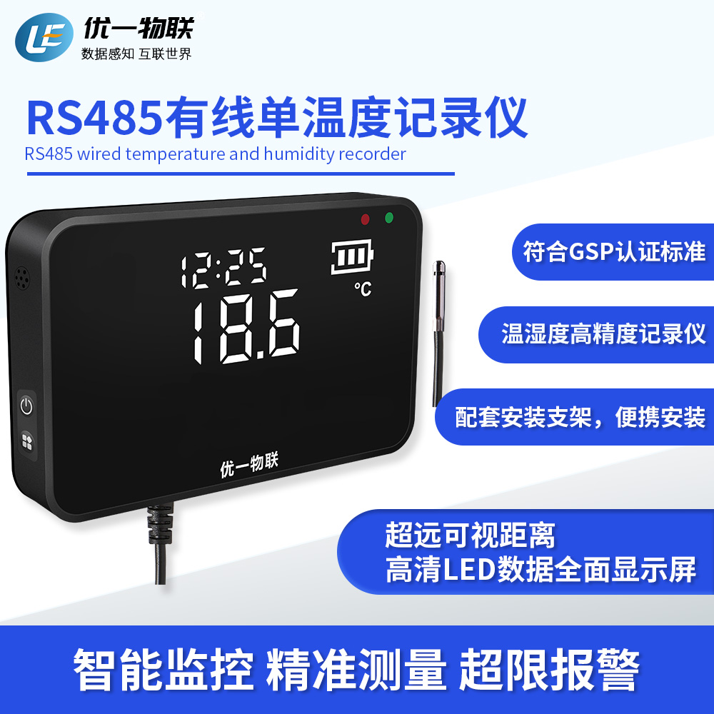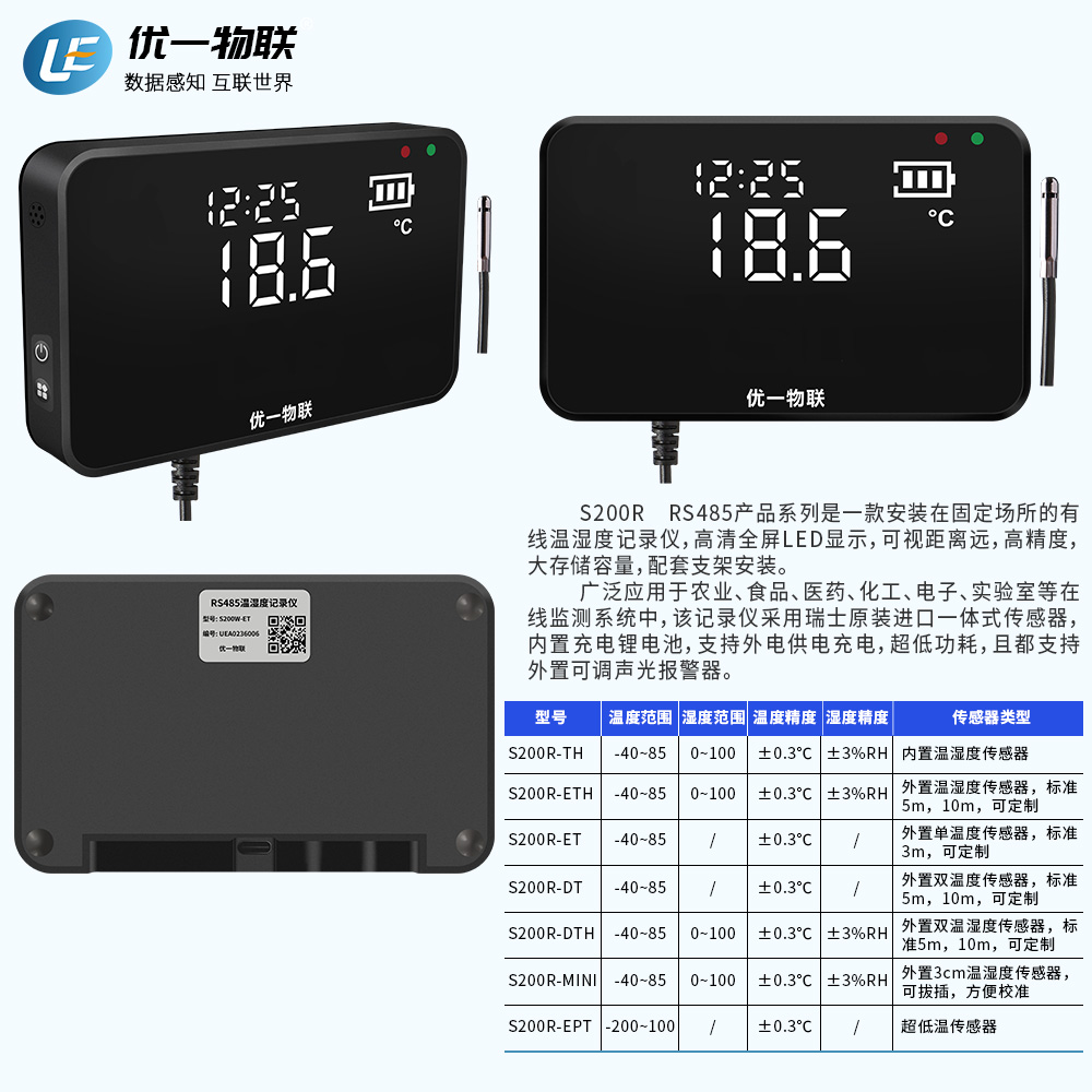 S200R RS485產(chǎn)品系列是一款安裝在固定場(chǎng)所的有線(xiàn)溫濕度記錄儀,高清全屏LED顯示,可視距離遠(yuǎn),高精度,大存儲(chǔ)容量,配套支架安裝。 廣泛應(yīng)用于農(nóng)業(yè)、食品、醫(yī)藥、化工、電子、實(shí)驗(yàn)室等在線(xiàn)監(jiān)測(cè)系統(tǒng)中,該記錄儀采用瑞士原裝進(jìn)口一體式傳感器,內(nèi)置充電鋰電池,支持外電供電充電,超低功耗,且都支持外置可調(diào)聲光報(bào)警器。